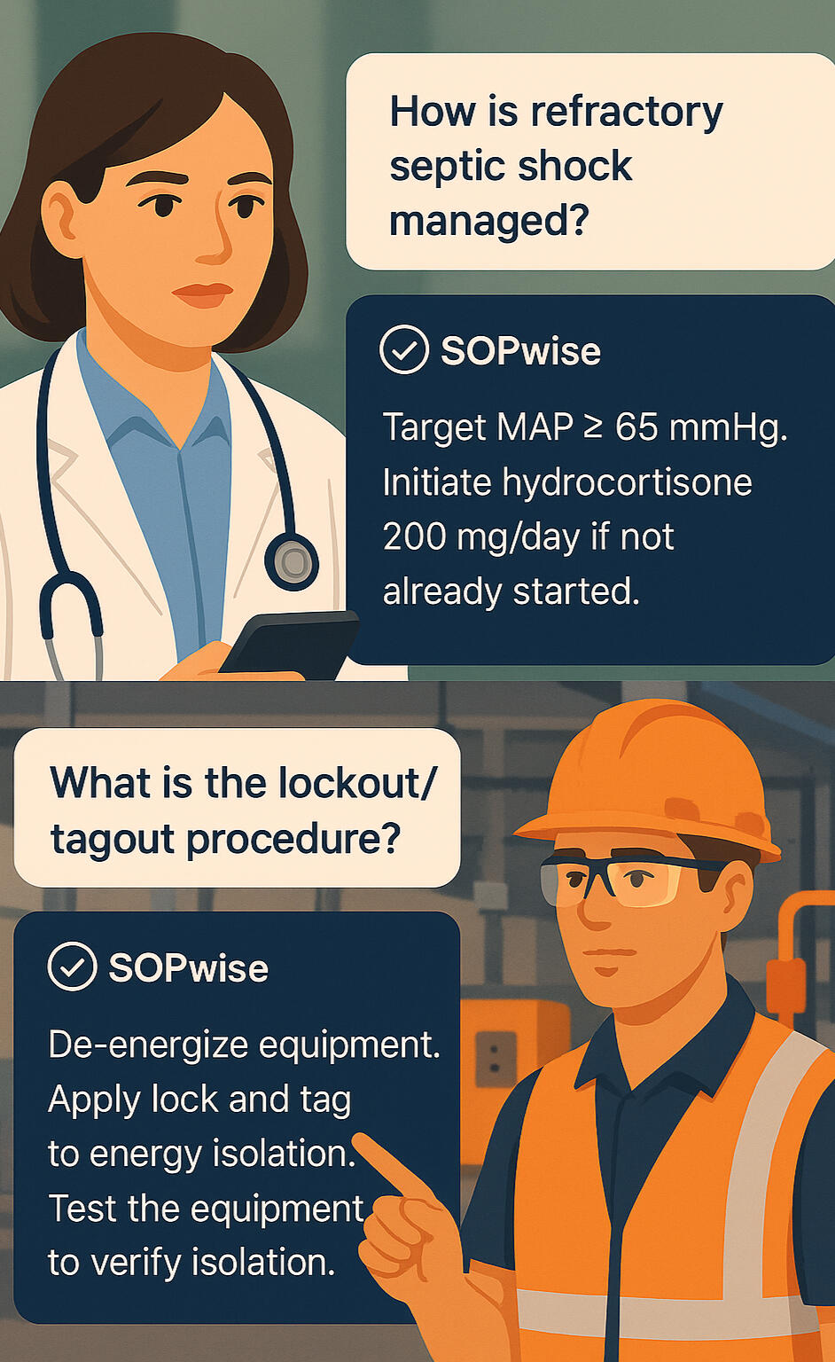 Upload your SOPs (clinical protocols, factory procedures, lab workflows, IT runbooks)
